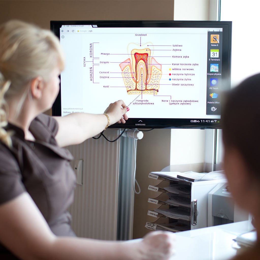 uwagę poświęcamy temu, aby Państwo mieli kontrolę nad procesem leczenia i byli świadomi jego słuszności oraz pozytywnego wpływu na zdrowie. Każda procedura medyczna jest omawiana przed i po zabiegu. Uzupełnieniem słów lekarza jest widok z wysokiej rozdzielczości kamery wewnątrzustnej na monitorze LCD.